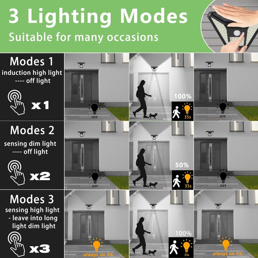 - 【3 optional lighting modes 】The solar security lights outdoor motion sensor has 3 operating modes to choose from: 1. From no light mode to 100% brightness sensor mode (if no movement is detected in 35 seconds, it will be turned off); 2. From No light mode to 50% brightness sensor mode (off if no motion is detected in 35 seconds); 3. Dark light mode (Dark light is turned on at night, and 100% brightness lasts for 35 seconds when motion is detected). Provide convenience and security for your life.